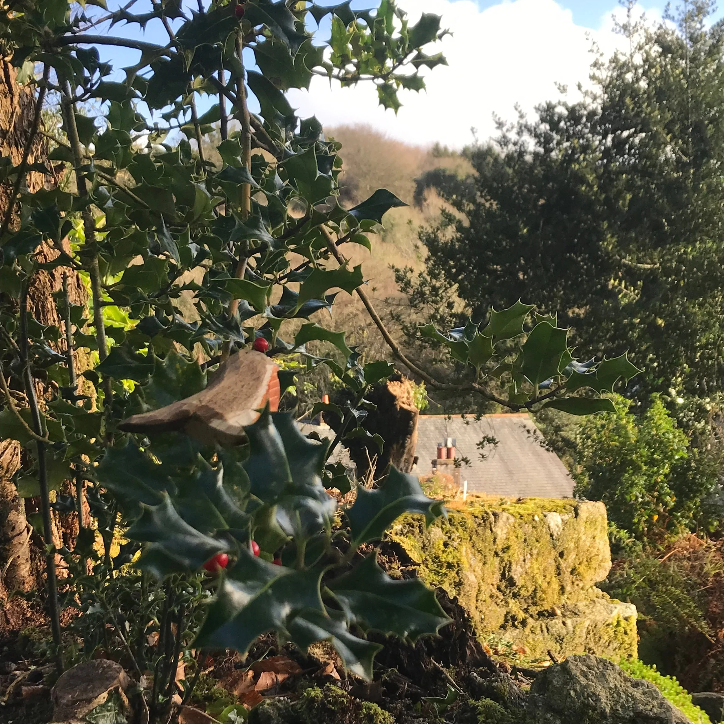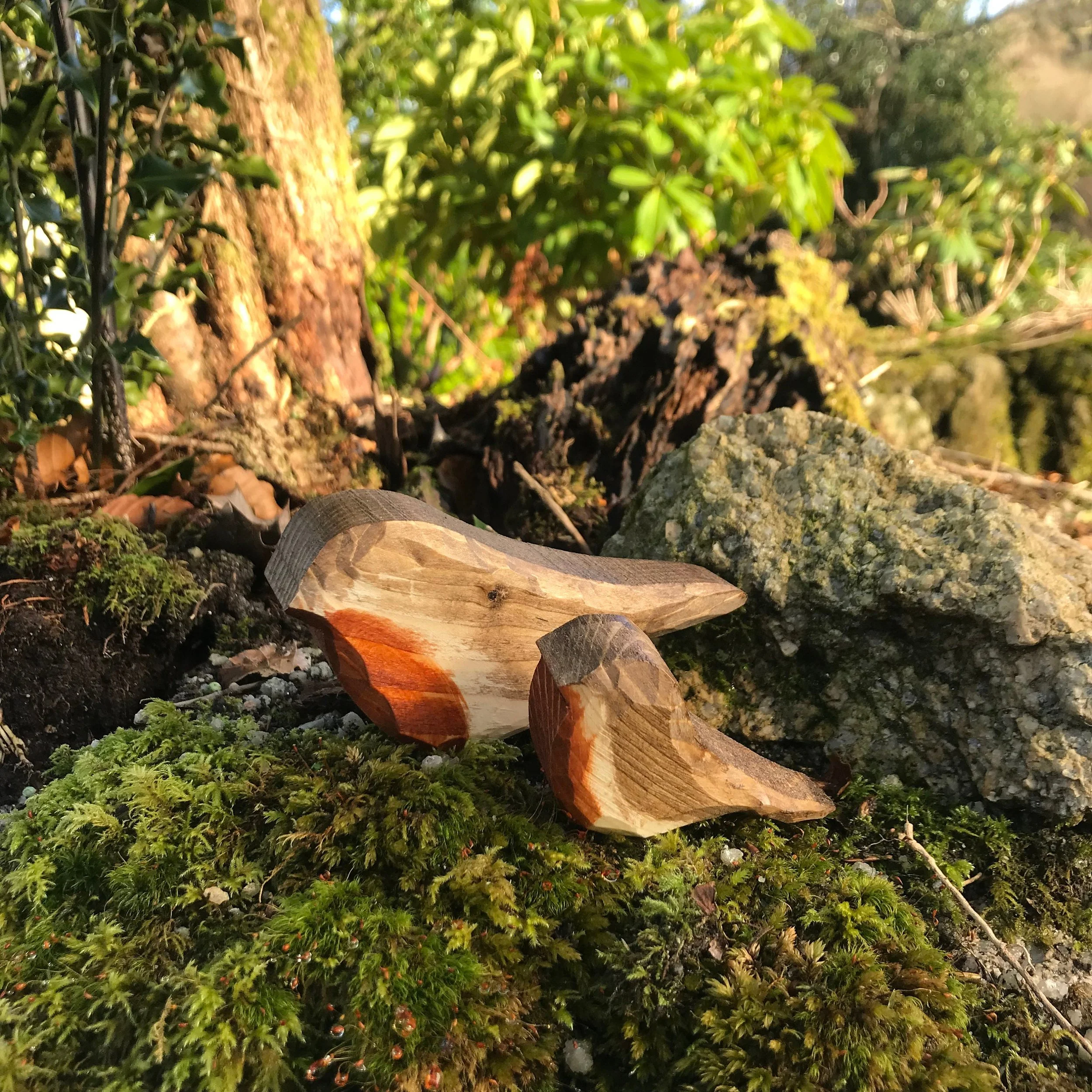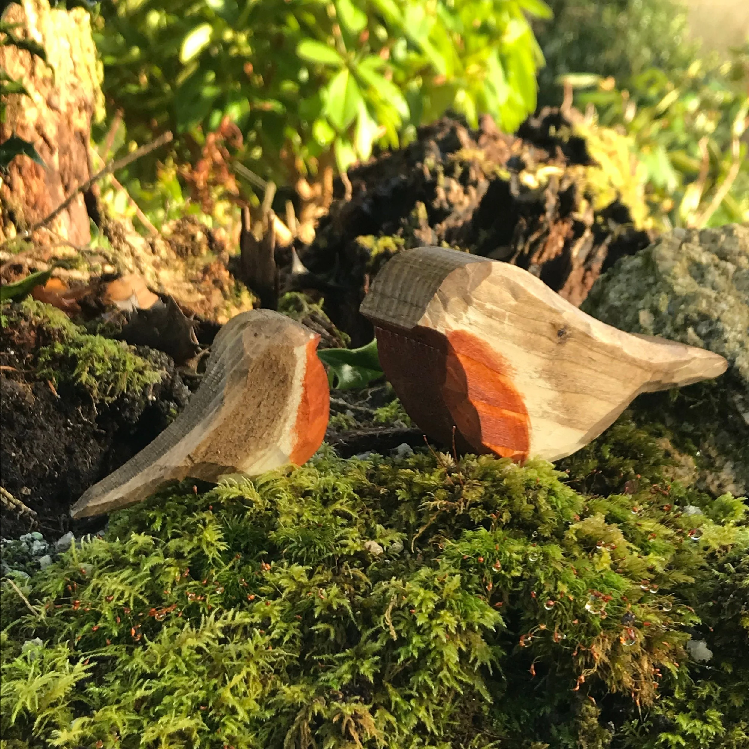 Wooden Robin and Fledgling Hand carved ornaments for House or Garden